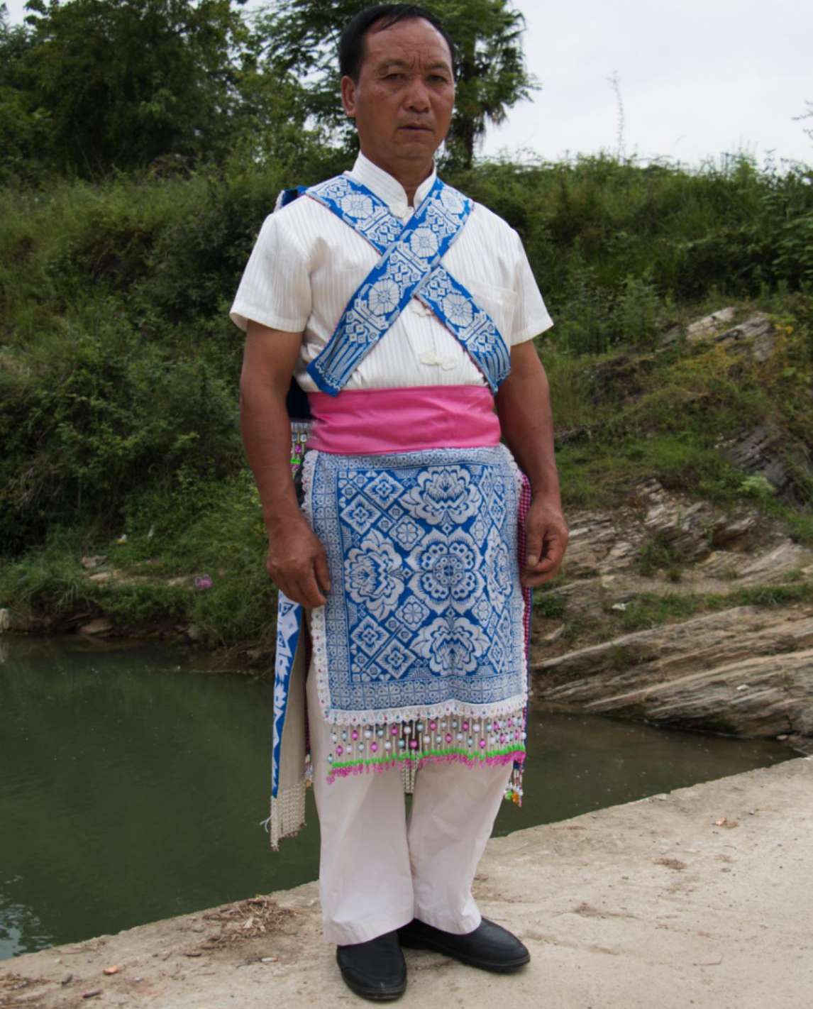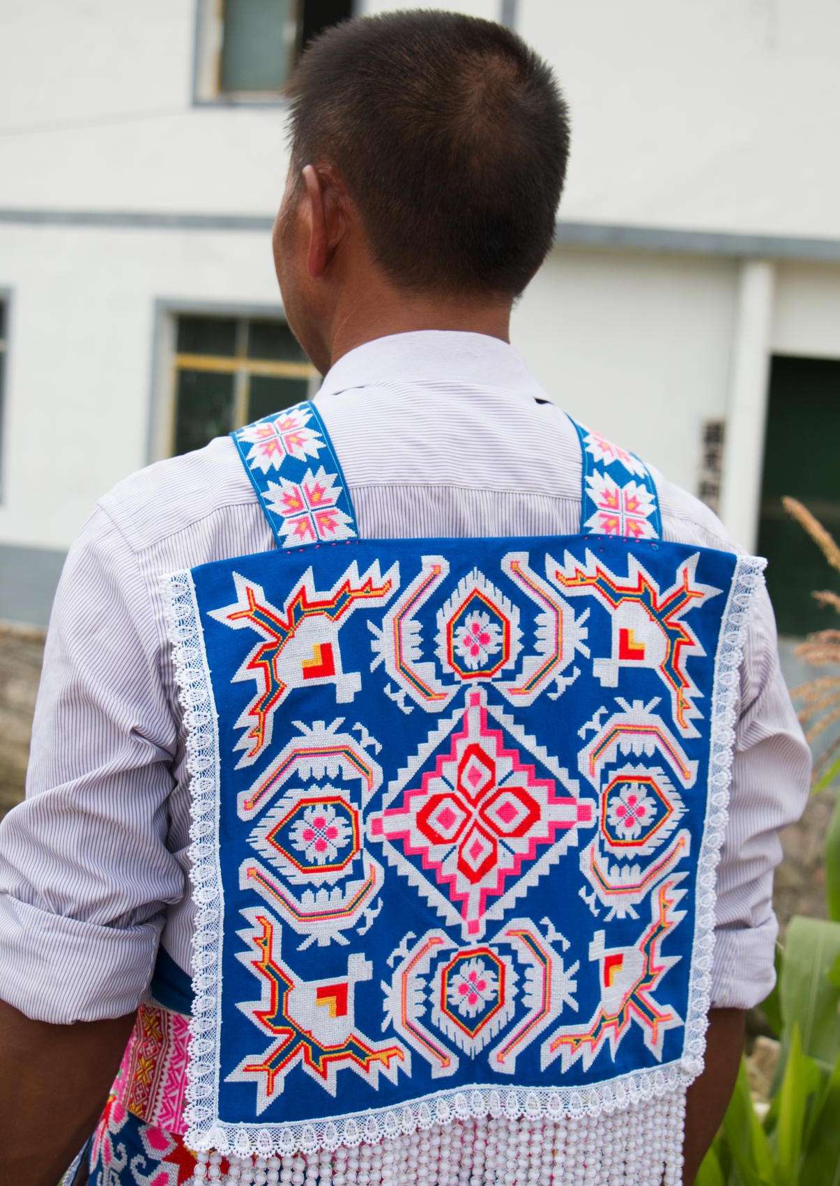 谷立村男子服饰相对于苗族女子服饰则显得较为简朴,男子上身主要穿着白色打底的对襟衣,身后背有背牌,背牌底色为蓝色,上绣有花朵图案作为装饰。下身主要以蓝色打底的围裙为主,身前围裙,上面布满刺绣图案。身后的围裙则为一条条独立的丝带,丝带上同样布满花纹刺绣图案,在其底部还串有珠帘作为装饰。