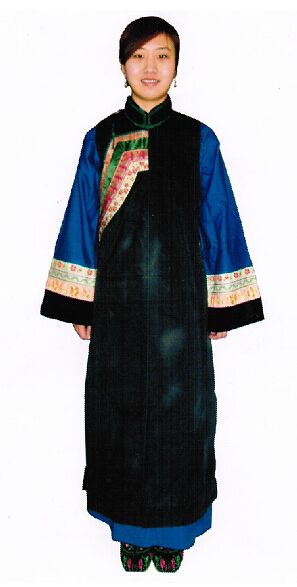 科尔沁蒙古袍款式较合身,长袍下摆窄且开衩。格外注重刺绣装饰、穿偏开襟长坎肩、工艺精湛的尖头靴和已婚妇女发髻式珊瑚头饰等是科尔沁服饰最显著的特征。