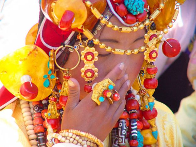 女子头上一般梳三四十条小细辫辫,收拢的辫梢上缀有珠宝和彩色丝穗,再戴上以琥珀球为主(戴单不戴双),配以红珊瑚。绿松石等珠宝的头饰,华丽而高贵。