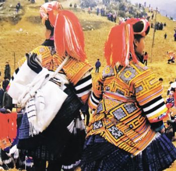 要论“叠穿”的数量之最,则当属贵州大方县显母村的苗族女性了。与苗族惯用银饰的固有印象不同,这里的苗族女性鲜以银为饰,她们用数量极为可观的服饰“叠穿”来彰显富裕。节日里,显母村的苗族女性换上盛装——数条百褶裙系在腰间,塑造出丰腴的臀部造型,内层裙子素净无花,外层裙子则布满条带状蜡染装饰。在这个难得的大型社交场合,未婚女孩通过“叠穿”后的独特造型来展示自己的魅力,衣物的数量和精致程度成为了吸引异性、获得肯定的重要标准和获得美好婚姻的重要条件。到了婚礼时,女性所着裙子的数量更是可达35条。婚后,她们要在裙边加上一圈深色边饰以作标识。