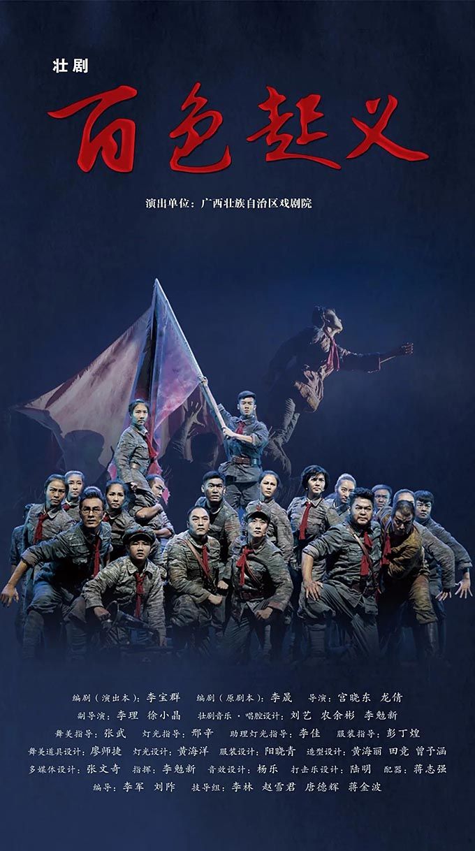 壮剧《百色起义》以1929年发生在广西的百色起义为素材创作而成,以百色起义的筹备、举行为主线,分为初到南宁、群雄聚会、英灵歌唱、百色大地等部分,通过独具广西特色的壮剧方式来表现红色历史题材,塑造了邓小平、李明瑞、韦拔群等众多百色起义指战员形象,讴歌了舍生忘死、救国救民的革命先烈和为中国革命付出巨大牺牲的壮乡人民。