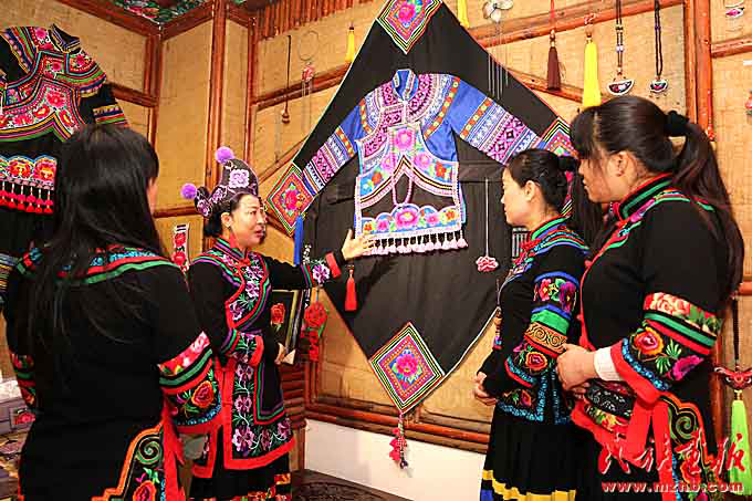 大姚县咪依噜民族服饰制品有限公司总经理罗珺给职工讲解彝族服饰文化
