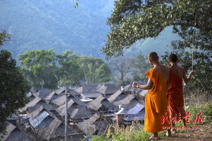扶贫攻坚决定张家老寨全部拆除重建,两位僧人注视着即将消亡的老寨(摄于2015年1月,布朗山张家老寨)