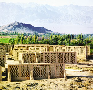 吐鲁番晒葡萄干的“阴房”。这里处于我国海拔最低的盆地,也是维吾尔族聚居区,冬冷夏热,民居既要防寒又要防暑。吐鲁番盛产葡萄,每户皆有晒葡萄干的阴房,因此,住房与阴房合一的民居成了吐鲁番的特色。大的阴房都集中建在山坡上,以利运输,小的阴房