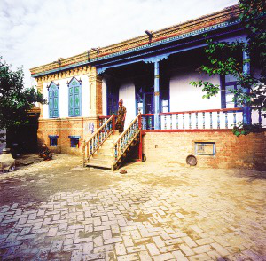 和田的“阿以旺”民居。和田地处塔克拉玛干沙漠的南部,冬冷夏热,干旱少雨风又大,蒸发量是降雨量的几十倍。为了适应气候,维吾尔人创造了平顶土房,房内居室分冬室和夏室两部分。在维语中,“夏室”又称“阿以旺”,建筑前面的外廊,其地面高出院落地面近一米,形如土炕,铺毡毯,是每年5 ~ 11月份日常生活、待客的主要场所,晚间铺被褥即可睡觉。设天窗侧向采光