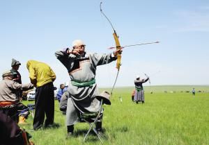 射箭是借助弓的弹力将箭射出,分为射远、射准。最早用来狩猎,之后用于战争,最后才成为体育运动。在蒙古高原的很多岩画里,都有射箭的图案。与马的驯服使用一样,弓箭的使用增加了人类征服自然的威力和自信。