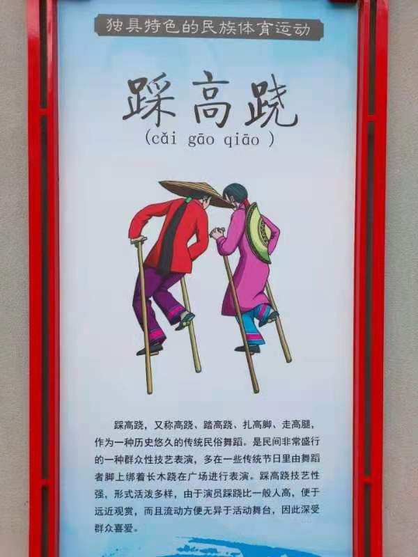 踩高跷,又称高跷、踏高跷、扎高脚、走高腿,作为一种历史悠久的传统民俗舞蹈。是民间非常盛行的一种群众性技艺表演,多在一些传统节日里由舞蹈者脚上绑着长木跷在广场进行表演。踩高跷技艺性强,形式活泼多样,由于演员踩跷比一 般人高,便于远近观赏,而且流动方便无异于活动舞台,因此深受群众喜爱。