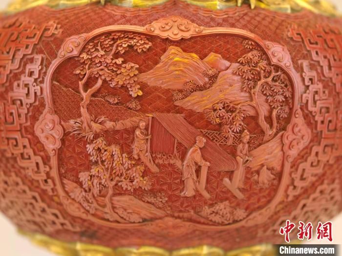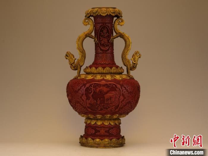 沈阳故宫展出乾隆款剔红开光山水人物纹龙耳瓶