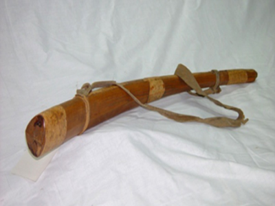 鄂温克族牛角形带箍木质鹿哨,长71厘米,红松木质地,1946年制作,鄂温克族传统拟声狩猎工具,也作为乐器。征集于内蒙古自治区喀尔古纳左旗,藏于民族文化宫博物馆。鹿哨是中国北方及东北亚狩猎经济文化类型的重要实物遗存,有鲜明民族与地域特色。