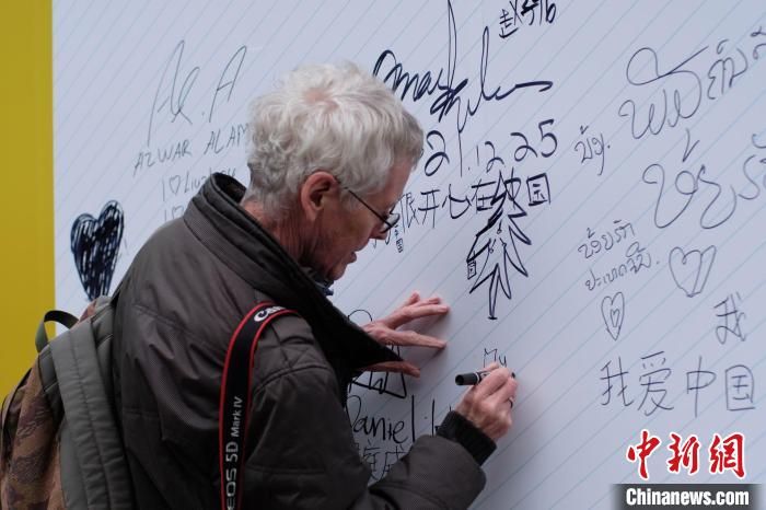 一名外国友人参观画展,并签名。 刘俊聪 摄