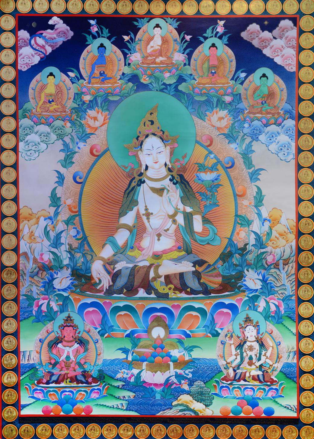 白度母性格温柔善良,非常聪明,没有能瞒得过她的秘密。人们总爱求助于她,故又称为救度母;白度母身色如雪山洁白,面目端庄祥和,双手和双足各生一眼,脸上有三眼,因而又称为七眼佛母。相传额上一目观十方无量佛土,其余六目观六道众生。