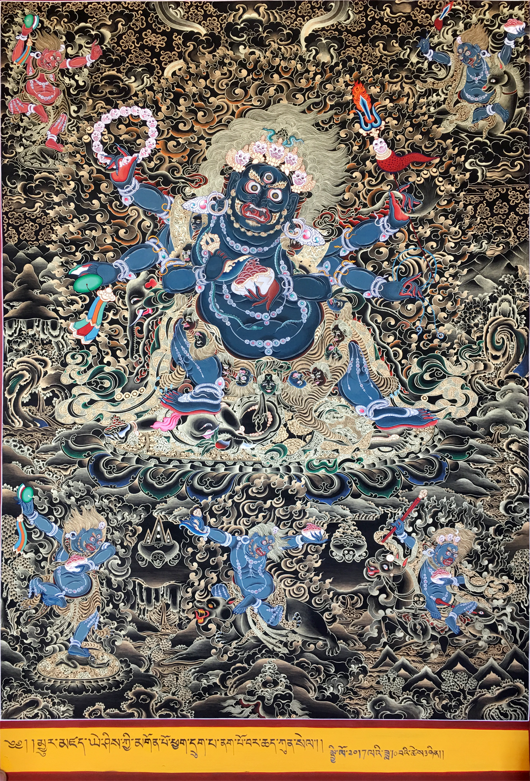 六臂玛哈嘎拉(梵语:Mahakala,藏语:Gonpo)又意译为大黑、大时、大黑神或大黑天神等,或者直接音译为摩诃迦罗(佛经中经常出现的名字)、莫诃哥罗、玛哈嘎拉等名称。该神本是婆罗门教湿婆(梵语:Shiva,梵语又名:Mahesvara,即大自在天)的变身,后为佛教吸收而成为佛教的护法,特别是在密宗中大黑天是重要的护法神。藏传佛教认为大黑天是毗卢遮那佛(梵语:Vairocana,藏语:nam par nang zhe,或称为大日如来)降魔时呈现出的忿怒相。