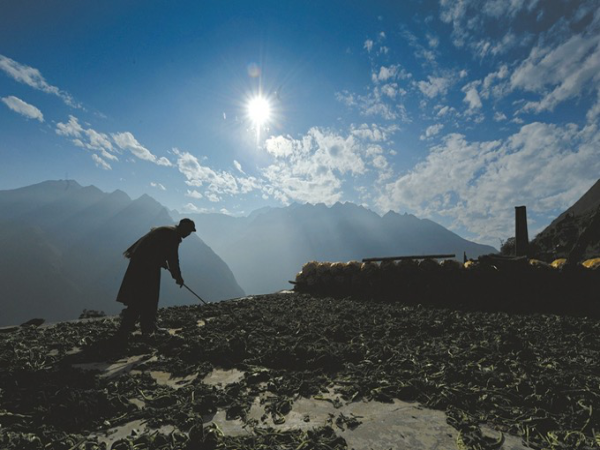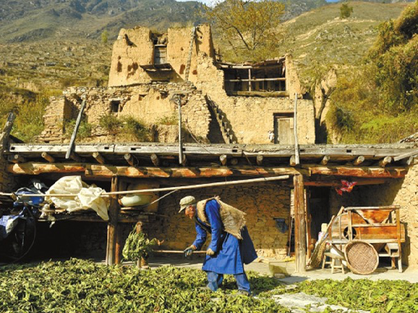 68岁的杨庆平在屋顶上晾晒烟叶,远处矗立着地震中唯一保存完好的碉楼