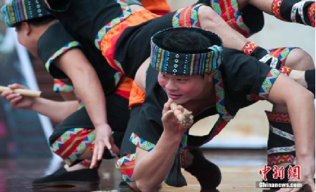 12月6日,在中国瑶族之乡广西金秀瑶族自治县的盘王节上,当地瑶族百姓在跳”刀舞”