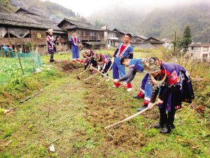 行走瑶山,笔者还领略了流传久远的“挖地歌”。这是类似船夫拉纤喊号的民间文艺形式,几十或百多人在又高又陡的岭坡上一字排开垦荒,于鼓锣声中亦唱亦作,内容或打情骂俏,或家长里短,或生产劳作。