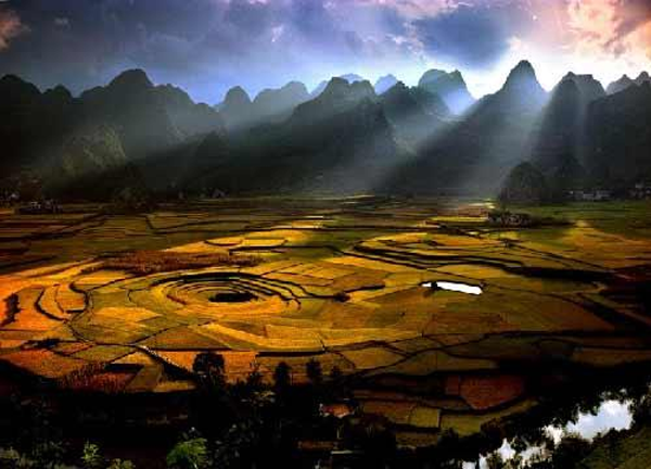 布依族又被称作“水稻民族”,“纳”在布依语里即是“水田”的意思。纳灰村的田坝,以八卦田最为奇特。八卦田为宽而浅的碟状漏斗,是地下河水对可溶性石灰岩溶蚀后形成的地形特征,村民们以中间的洞口同心圆耕种,根据地势起伏垒起田埂,一道道弯曲的田埂就变成了富有韵律的线条,形同道家的八卦。村民们把这些漏斗当做上天的恩赐,雨水过剩的季节,它可以排放多余的雨水,干旱的时候,人们又可以从漏斗中间的空心石柱抽水上来浇灌田地。