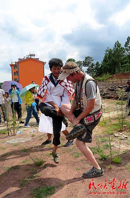 在游乐园里,外国朋友饶有兴致地参加传统民族体育项目