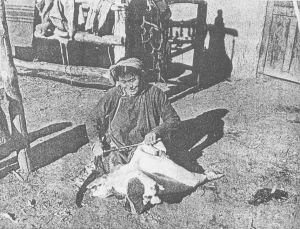鄂伦春族妇女在揉皮子