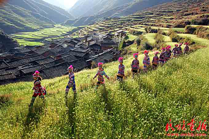 彝族姑娘们头上戴着绣有马缨花图案的传统鸡冠帽