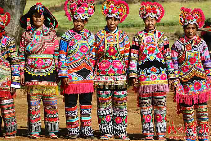 彝族女子不分老少,服装上都绣满花卉,鲜艳夺目