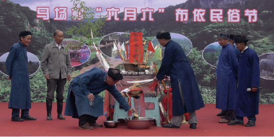 祭祀活动由寨老主持。牛头、活鸡等祭品供于案前,寨老穿着布依族的蓝袍,诵颂着古老神秘的经文,黝黑的脸上写满了对祖先、神灵的虔诚。而其他几位德高望重的寨中老人,这时便协力杀了鸡,人们用鸡血淋纸旗插于火盆中,以火盆代替稻田,意为雄鸡吃尽蝗虫,粮食丰收,马驮不尽。