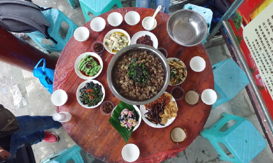 喝罢三碗阿姐手中的米酒,这满桌的美食就等着动箸了。长桌宴席的主菜,即是为了“六月六”祭祀而宰的牛。那一大盆牛肉堆积如山,面上洒满薄荷,清香四溢,味美量足,一桌人都吃不完。一方面足见布依人民的豪爽,另一方面也许是为了大家相聚的时间更多,在餐桌上把酒言欢。
