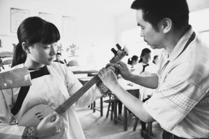 图为一位音乐教师在指导学生调试侗族琵琶。 王炳真摄影报道