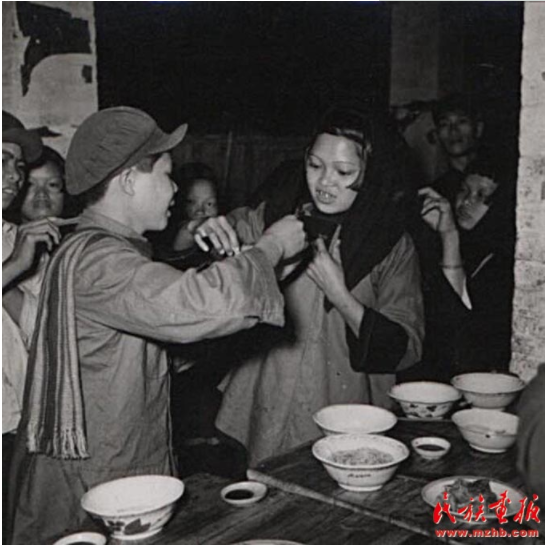 “歌圩”是桂西壮族古老的风俗。每年农历正月、二月、四月都有歌圩日。图为1957年广西壮族自治区凭祥市郊区的歌圩日,这里不但处处欢歌笑语,还有抢花炮、演壮戏、舞彩龙、舞彩凤、唱桂剧等很丰富的文娱活动