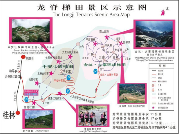 龙脊古壮寨概况龙脊古壮寨位于广西桂林市龙胜各族自治县的和平乡境内,隶属于著名的龙脊梯田风景名胜区范围,距离龙胜县城21公里,距桂林市区约76公里,总面积约4.2平方公里,其中有梯田1100亩。古壮寨已有500多年的历史,龙脊是行政村,全村寨共7个自然村,分别是岩湾、岩板、岩背、七星、廖家,侯家和潘家,共241户壮族人家。龙脊村位于阳山县七拱镇北部(2004年5月12日区域调整时原新圩镇并入七拱镇,龙脊随着并入七拱镇),镇政府驻地距县城20公里,省道S114贯穿南北,省道S260线经圩镇而过。总面积16平方公里,耕地面积1346亩。4个村民小组,总人口6888人。