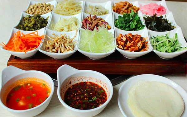 制作方法:烙。面粉加水,盐少许揉匀擀透(水与面粉比例为1:6),平锅烧热刷油、擦干,然后左手抓起面团甩圆并向锅底杵一下成为直径为9厘米的圆薄皮时,右手立即把圆形面皮揭起,这样制作数十张春卷皮,放入蒸笼稍蒸一下使其回软,便于包食。再将绿豆芽、海带丝、芹菜节、蕨菜节用开水氽过,分别装入小盘中,小碗内放入酱油、醋、味精、麻油、姜沫、葱花、辣椒兑成汁。春卷皮中放入各种素菜丝包成上大下小的兜形,放入酥黄豆或油炸花生,浇淋兑好的辣椒汁即成。