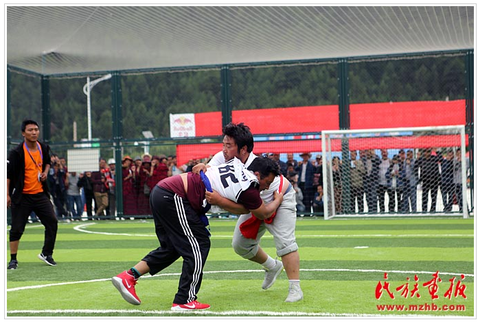 甘肃省甘南藏族自治州的迭部县安多地区则巴邀请赛男子摔跤80公斤以上比赛(民族画报记者 黄若天 摄影)