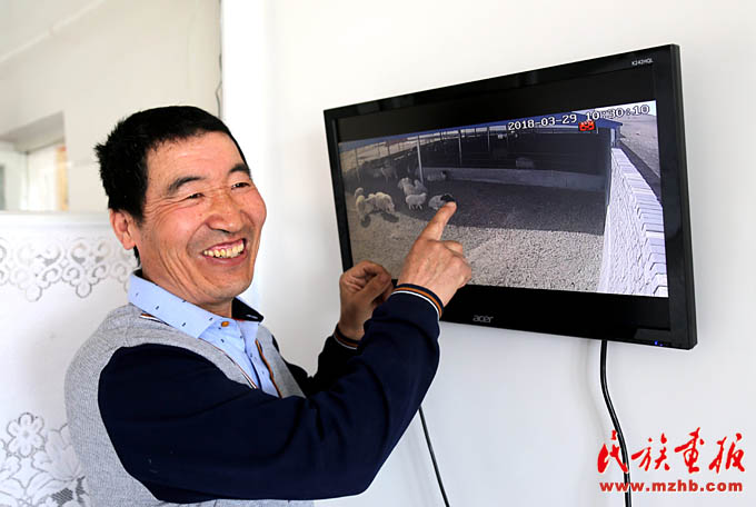 牧民朱宝忠利用监控器可随时了解棚舍里羊群的情况