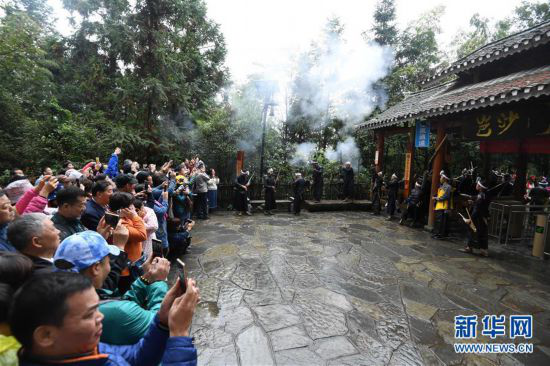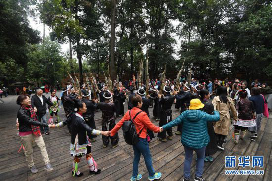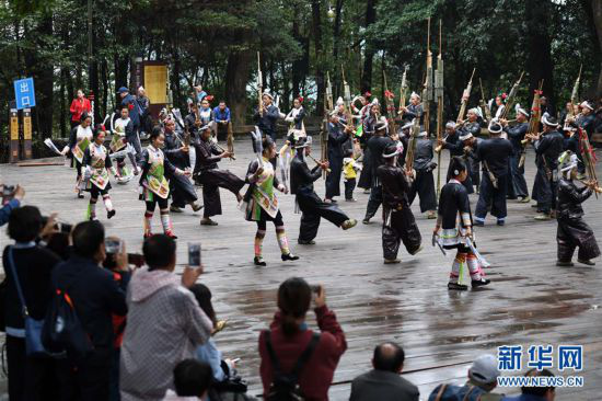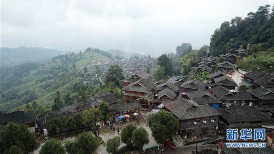 2018年10月16日,游客在贵州省从江县丙妹镇岜沙苗寨观光(无人机拍摄)。金秋时节,大批游客来到贵州省黔东南苗族侗族自治州从江县丙妹镇岜沙苗寨,观赏苗寨美景,体验苗族风情。