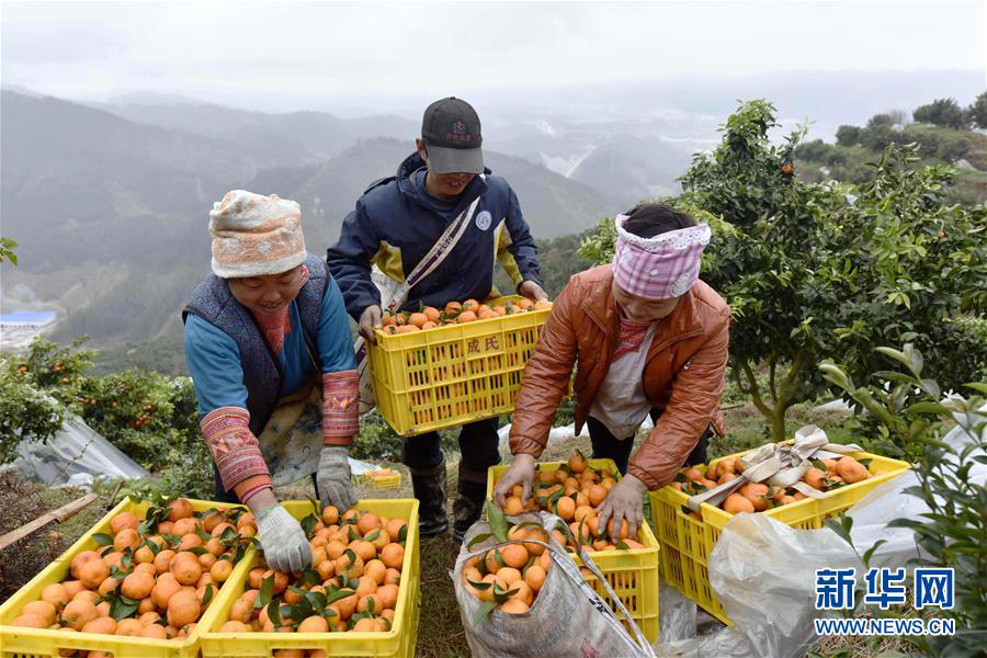 3月2日,在贵州榕江县忠诚镇王岭村砂糖橘种植基地,果农在装运砂糖橘。