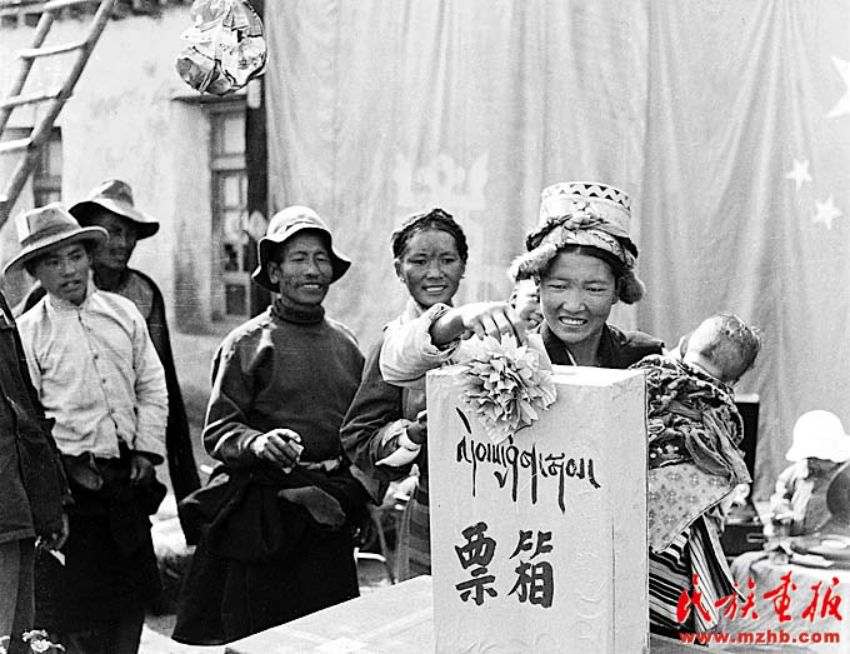 1962年7月,山南地区乃东县昌珠乡的翻身农民巴桑卓玛穿上新衣到选举乡人民代表的会场参加投票,她兴奋地投下了幸福的一票(苏俊慧 摄影)