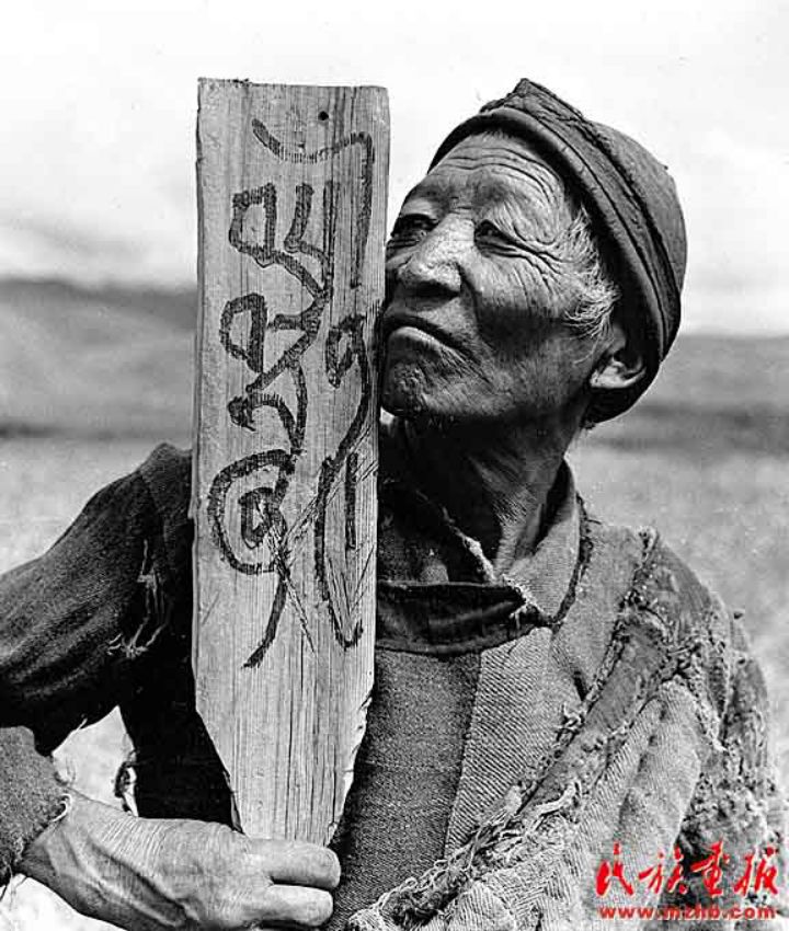 1959年,翻身的农奴第一次拥有自己的土地,桑登手里拿着写有“桑登的土地”的木牌久久不愿放下(蓝志贵 摄影)