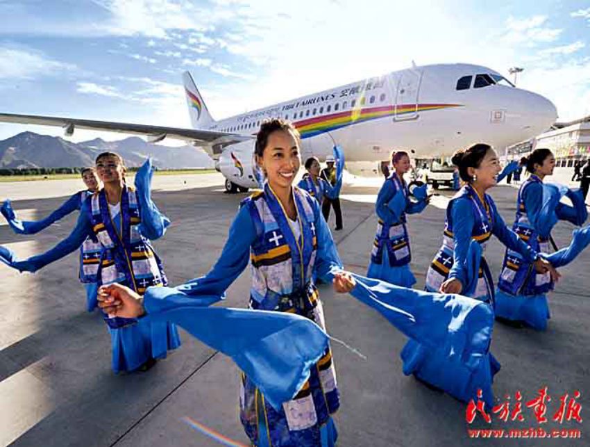 西藏已经建成使用的机场有拉萨贡嘎国际机场、阿里昆莎机场、昌都邦达机场、日喀则和平机场和林芝米林机场。西藏还拥有自己的航空公司,图为西藏航空有限公司成立暨首航仪式