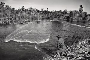 在伊犁河边撒网的男子