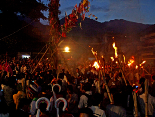 白族视火为生命与灵魂的护佑物,古有火崇拜习俗,火把节是白族对“生之礼赞和死之缅怀的节日”。火把节这一天,各村由年内新添子嗣之家作“会首”,在场坝中竖一高大的火把,常年扎十二台,润年扎十三台,顶端扎升斗旗帜,上书“风调雨顺”、“五谷丰登”字样,下悬花红、梨子、铜钱等物。天擦黑点燃火把,会首们以糖果、炒蚕豆、烟、茶、酒招待相聚在场坝中的老小。儿童则一手持小火炬,一手往火炬上拨洒松脂粉沐相戏,对新生的婴儿表示致贺礼赞。与此同日,新亡故者之家人须上坟祭祀,在新故者坟前或大门口竖一小火把,如是者三年,表示对死者的缅怀,与史书“星回日祭祖”的记载相合。