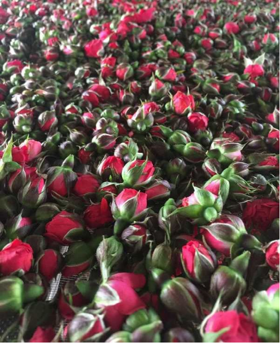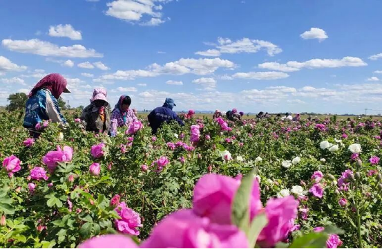 在阿舍乡清香玫瑰合作社的玫瑰花茶基地里,玫瑰花姹紫嫣红,争奇斗艳,美不胜收。为了抢抓玫瑰花采摘最佳时间,花农早晨5点多就已经忙活起来,他们穿行于花海之间,背着箩筐兴高采烈地采摘今年的第一波玫瑰花。