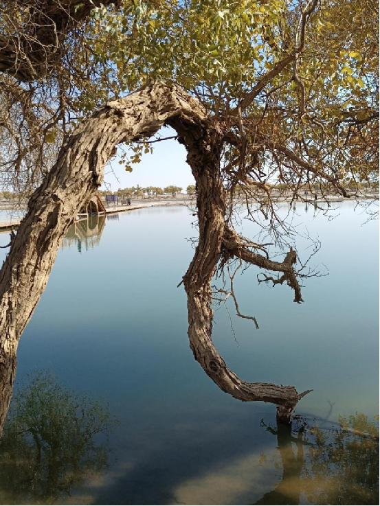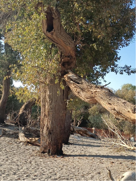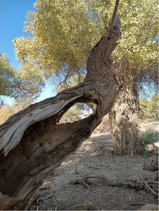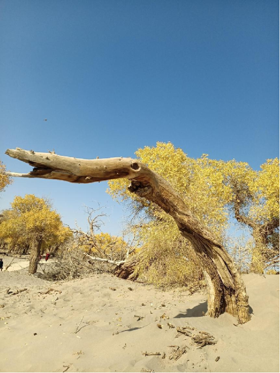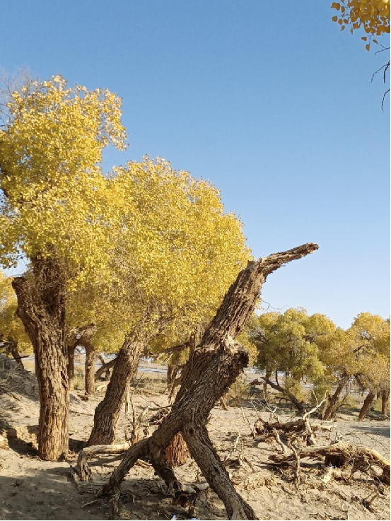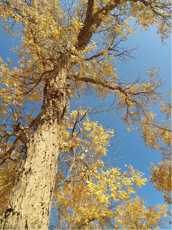 每当深秋季节,胡杨树叶变得一片金黄,形成胡杨秋色,树影婆娑,奇妙绝伦,赏心悦目。漫步在浓郁的胡杨林中仿佛进入神话般的仙境。茂密的胡杨千奇百怪,神态万般。粗壮的几人难以合抱,挺拔的七、八丈之高,怪异的似苍龙腾越,似虬蟠狂舞,令人惊奇不已,叹为观止。仅就密密匝匝的树叶,也是风采独有。幼小的胡杨,叶片狭长而细小,宛若少女妩媚的柳眉,人们常常把它误认为柳树;壮龄的胡杨,叶片又变成卵形、阔卵形或三角形,犹如兴安岭的白桦;进入老年期的胡杨,叶片才定型为椭圆形。更令人称奇者,在同一棵胡杨树冠的上下层次,还长着不同形状的叶片,因此,又称“异叶杨”