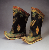 蒙古人爱穿靴子,蒙古靴分布靴和皮靴两种。布靴多用厚布或帆布制成,穿起来柔软、轻便。皮靴多用牛皮、马皮或驴皮制成,结实耐用,防水抗寒性能好。其式样大体分靴尖上卷、半卷和平底不卷的三种,分别适宜在沙漠、干旱草原和湿润草原上行走。蒙古靴做工精细考究,靴帮、靴靿上多绣制或剪贴有精美的花纹图案。