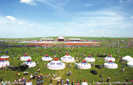 “那达慕”蒙古语为“娱乐”或“游戏”音译。为蒙古族的传统节日,据传始于汉代。一年一度由一旗或数旗联合在农历七八月举行,每次一至数日,规模大小不一。是时正是草原上气候怡人、绿草如茵、百花盛开、牛羊肥壮的黄金季节。节日期间,牧民们身穿节日新衣,乘马驱车,从四面八方汇聚一处。一时草原上五彩旗帜如霞云飘掠,蒙古包如点点珍珠,一片节日气象。大会上不仅有传统的赛马、摔跤、射箭等竞技项目,拔河、蓝球、下蒙古象棋等体育比赛,而且还有丰富多彩的文艺演出和琳琅满目的物资贸易交流。如今那达慕大会已经成为草原上集体育比赛、文化娱乐、经济贸易、庆贺丰收为一体的综合性盛大节日。