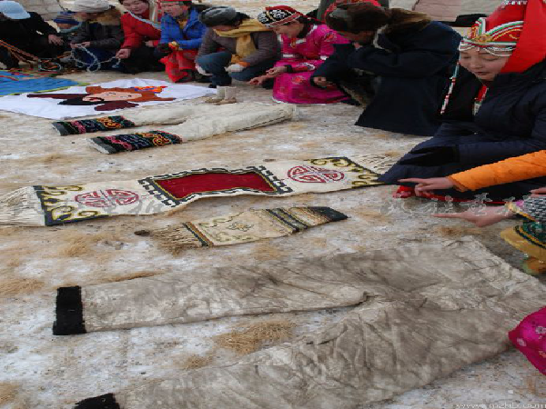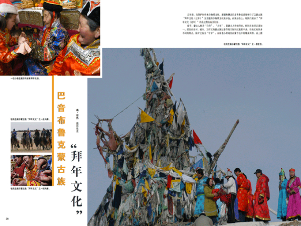 几年前,为保护和传承非物质文化,新疆和静县巴音布鲁克总场举行了以蒙古族“拜年文化(过年)”为主题的非物质文化展示会。在展示会上,牧民们展示了“拜年文化(过年)”的全过程及有关礼俗。