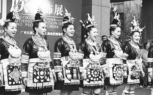 2015年5月23日,由贵州省民族博物馆、广西民族博物馆和上海纺织博物馆联合主办的“绚彩中华——中国侗族服饰文化展”在上海纺织博物馆举行。本次展览共展出近200件套侗族服饰,代表了不同时代、不同地域、不同支系、不同功能的侗族服饰。展期为期60天。图为来自贵州黎平县三龙村的侗族姑娘们,边唱着侗族大歌,边向观众们展示美丽的侗族服饰。