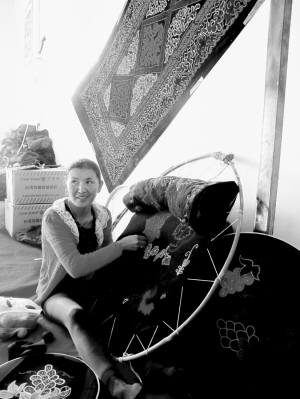 巴合提古丽展示她正制作的民族刺绣坐垫套