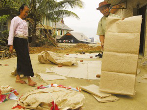 岩妞说,制作孔明灯最主要的材料是傣族的棉纸和竹编。棉纸来源于木棉树。傣家人摘取木棉树的树叶并用牛油来煎熬,使之变为暗白色的浆汁,待熬熟之后便拿到河边冲洗,把其中的灰尘和沙粒洗净。随后,将洗净的木棉树浆汁摊均匀后在阳光下曝晒,晒干后便能拿来制作孔明灯了。一般的纸很容易被烧坏,而这种手工制作的棉纸韧性好,不容易撕裂和烧坏。