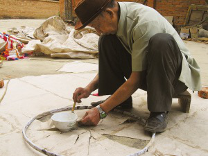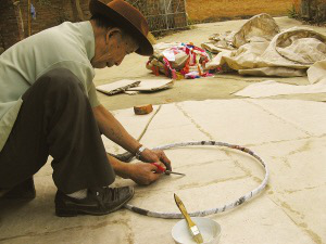 言谈间,岩妞把制好的竹环放入早已画好的同心圆图案中的小圆上,只见竹环大小正好与小圆吻合。岩妞说,图案外侧的大圆便是摆放棉纸用的。接着,他把手中厚厚的几张棉纸围绕着已经放入图案中的竹环依次摆入,直至摆满。在同心圆图案的上侧,岩妞还画了一个宽与同心圆图案的直径相符的矩形图案,把棉纸铺满其中。岩妞说,这图形就是“贡菲”的高度。制作的最后一道程序,是把棉纸用浆糊粘合起来。阴干后,一个“贡菲”就做好了。