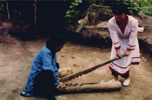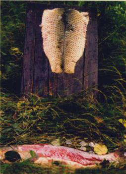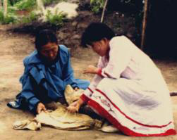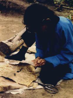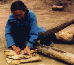 图八 图九 赫哲族妇女用木铡刀熟鱼皮 将熟好的鱼皮连成大片