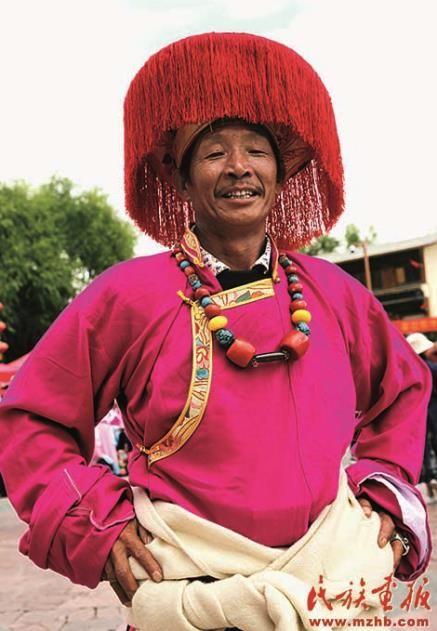 云南省迪庆藏族自治州藏族男子的红色头饰。